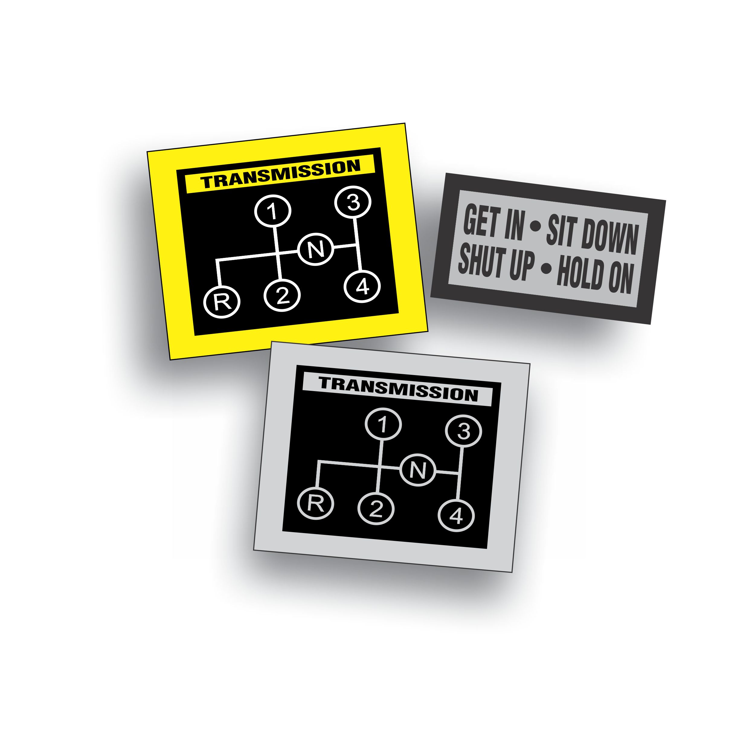 Car, Jeep or Truck, Passenger Car Shift Pattern 4 Speed Manual Trans Pattern Size 2 x 2 1/2 inch, Yellow-Black and Black-Silver SKU: AR084D Sold as a pair plus extra Hold On Decal for $12.84 Image with Decal Specifications |